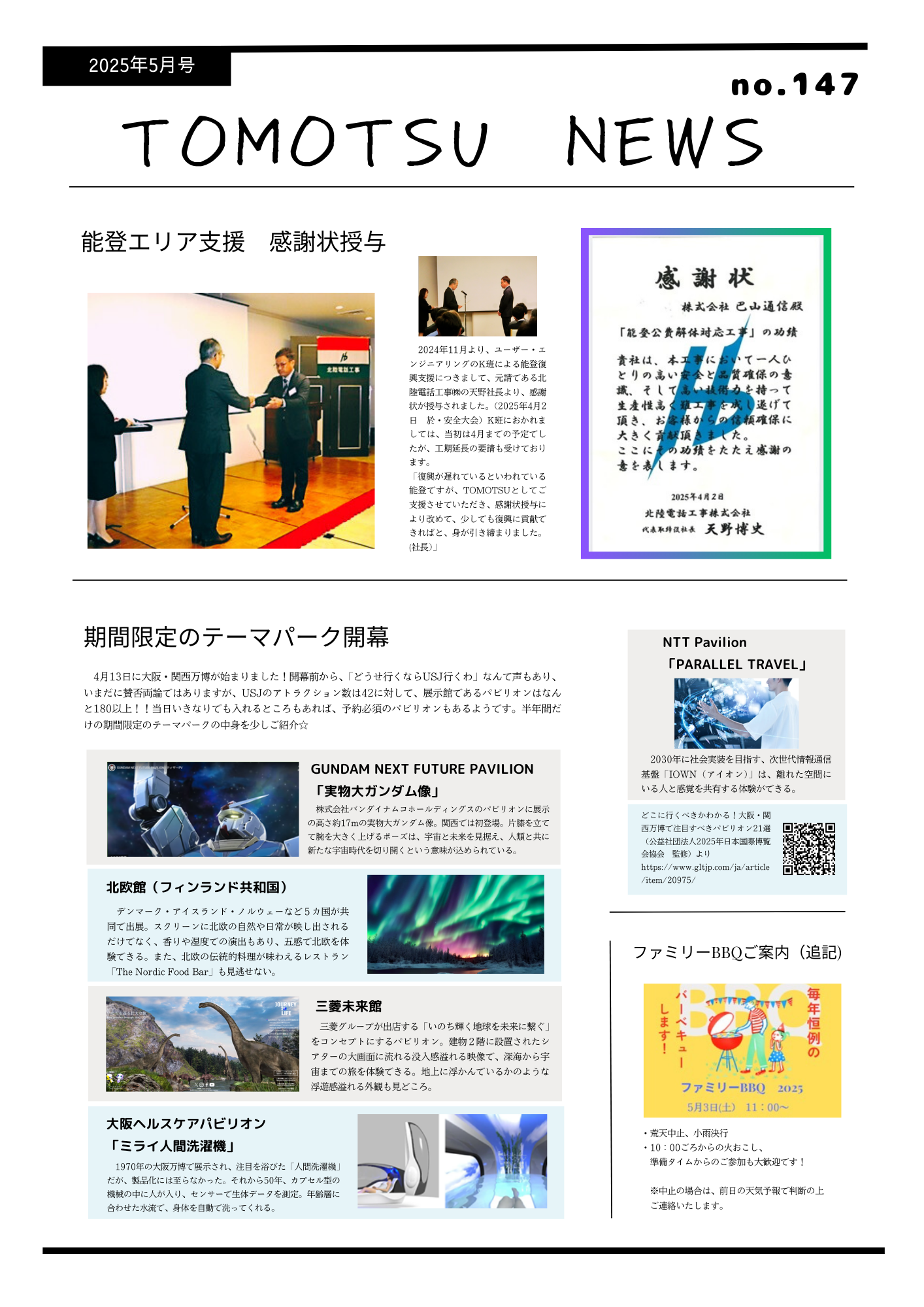 能登エリア支援 感謝状授与 2025-04-02 07:51:00 UTC 2024年11月より、ユーザー・エンジニアリングのK班による能登復興支援につきまして、 元請である北陸電話工事㈱の天野社長より、感謝状が授与されました。 (2025年4月2日 於・安全大会) K班におかれましては、当初は4月までの予定でしたが、工期延長の要請も受けております。 「復興が遅れているといわれている能登ですが、TOMOTSUとしてご支援させていただき、 感謝状授与により改めて、少しでも復興に貢献できればと、身が引き締まりました。(社長)」
